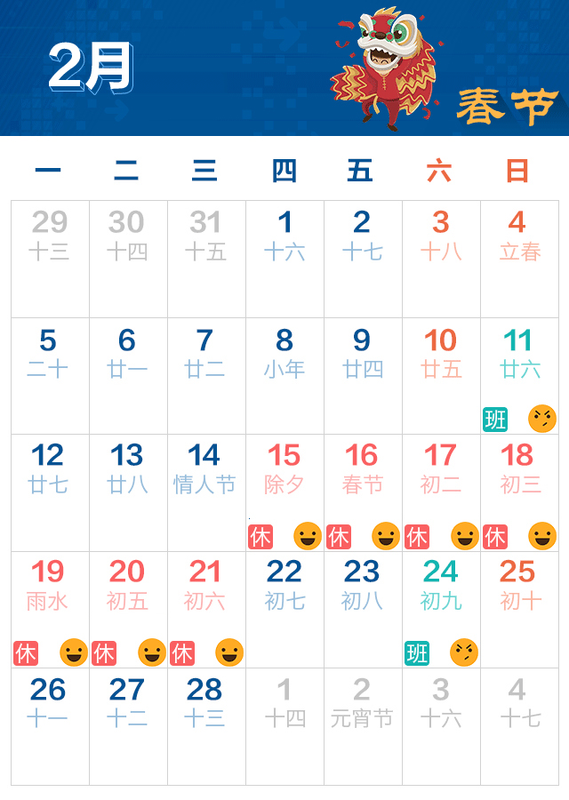 我司2018年春節(jié)假期由2月15日(除夕)至2月21日(年初六),共七天,2月22日星期四(年初七)正式上班,2.11日星期日、2月24日星期六補(bǔ)班一天。