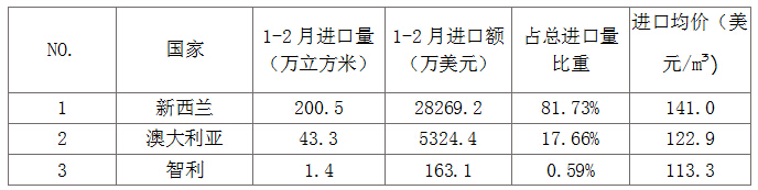 2018年1-2月,我國輻射松原木累計進口量排名靠前的國家分別是新西蘭、澳大利亞和智利(詳見表2)。其中新西蘭和澳大利亞是我國輻射松原木進口主要來源國,2018年1-2月我國自新西蘭共進口輻射松原木200.5萬立方米,占我國1-2月進口輻射松原木總量的81.73%,1-2月我國自澳大利亞進口輻射松原木43.3萬立方米,占我國1-2月進口輻射松原木總量的17.66%,自新西蘭和澳大利亞進口的輻射松原木總量占我國1-11月輻射松原木進口總量的99.39%。