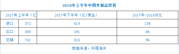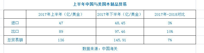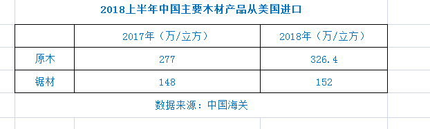 海關(guān)數(shù)據(jù)顯示,2018年上半年,中美木制品貿(mào)易額達145.91億美元,比2017年同期增長7%,同比增長緩慢。從美國進口的木制品占全國進口總量的18%,與2017年上半年持平。其中,中國對美出口額增長10%,達到97.46億美元。中國從美國的進口額僅增長3%,達到48.45億美元??傮w而言,美中貿(mào)易增速正在放緩。