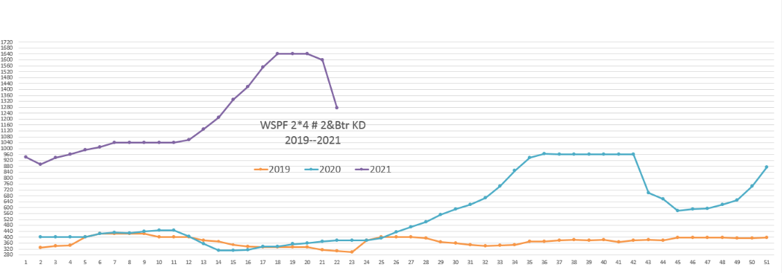? ? 比如今年3月12日云杉,松木,冷杉二乘四板材的基本價格是每千板英尺1,040美元,而2019年的年平均價格為每千板英尺372美元。